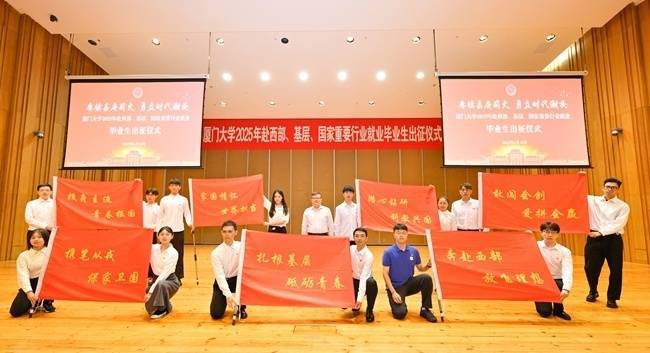 2025年6月19日,厦门大学以“赓续嘉庚薪火勇立时代潮头”为主题,举行2025年赴西部、基层、国家重要行业就业毕业生出征仪式,送别即将奔赴祖国各地干事创业的毕业生